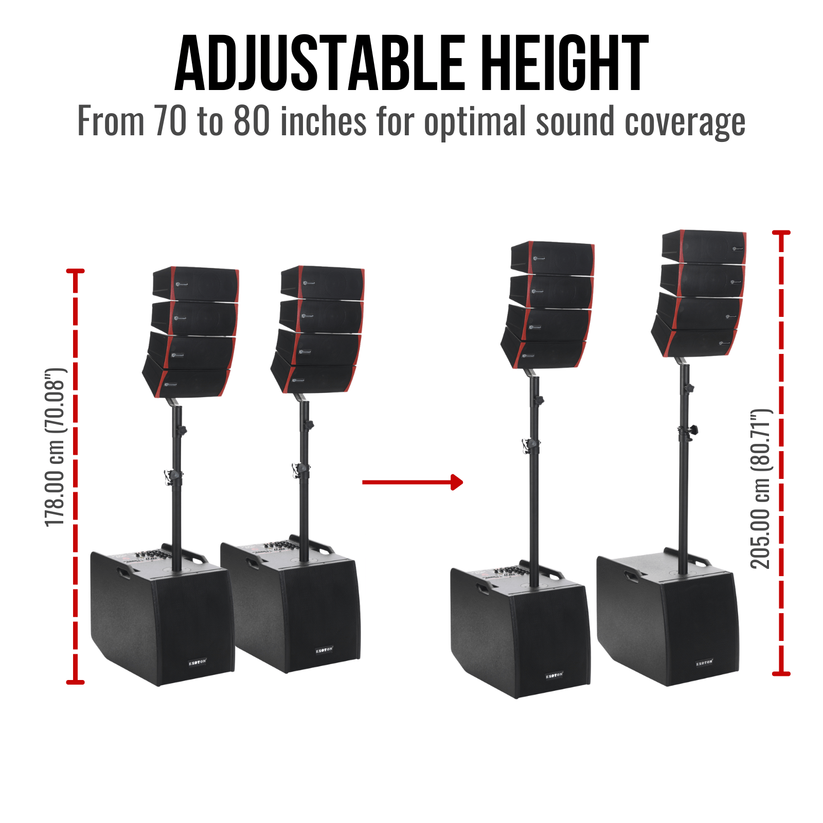 Adjustable Poles & Side Handles: Telescoping speaker poles allow the line arrary part to be adjusted from 70 to 80 inches to suit your venue. Ergonomically designed side handles make lifting and transporting the dj speaker easier and more comfortable.